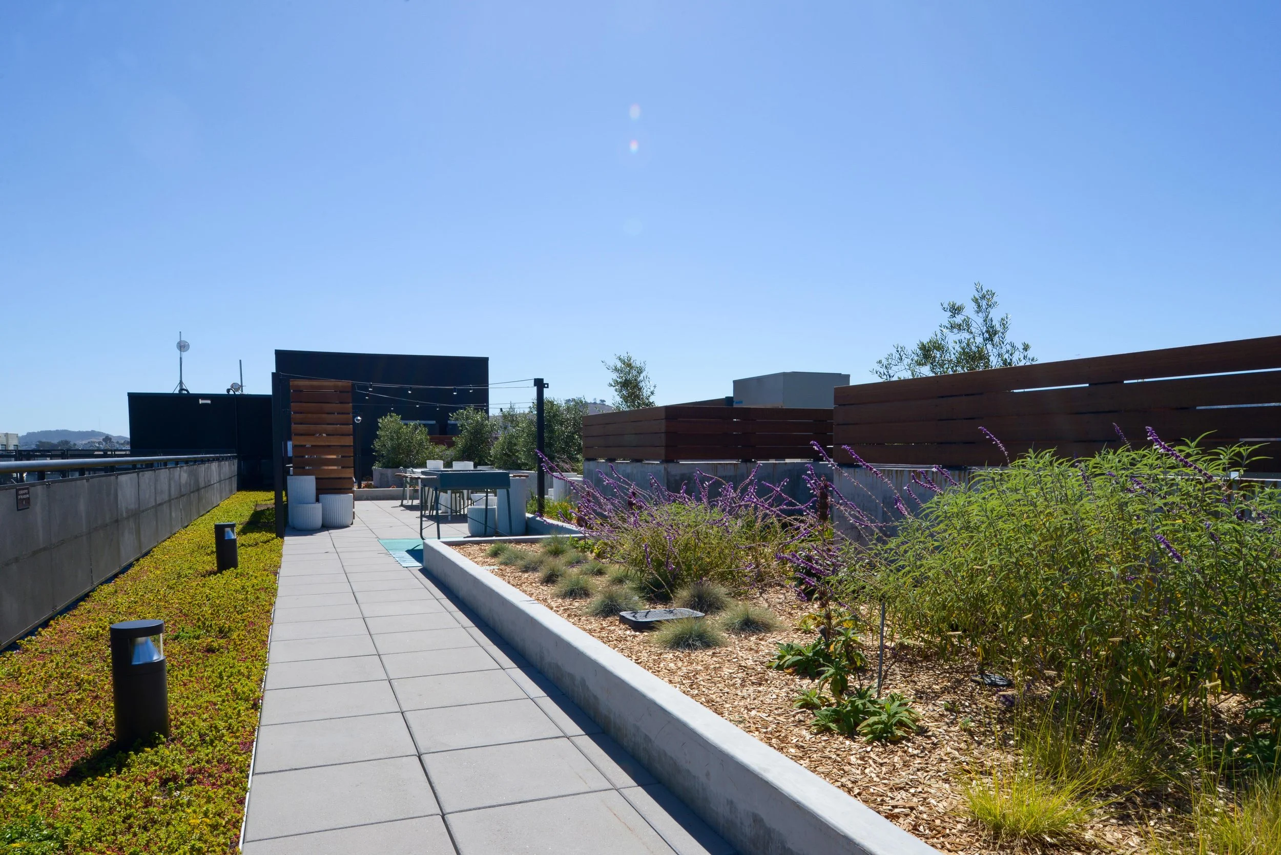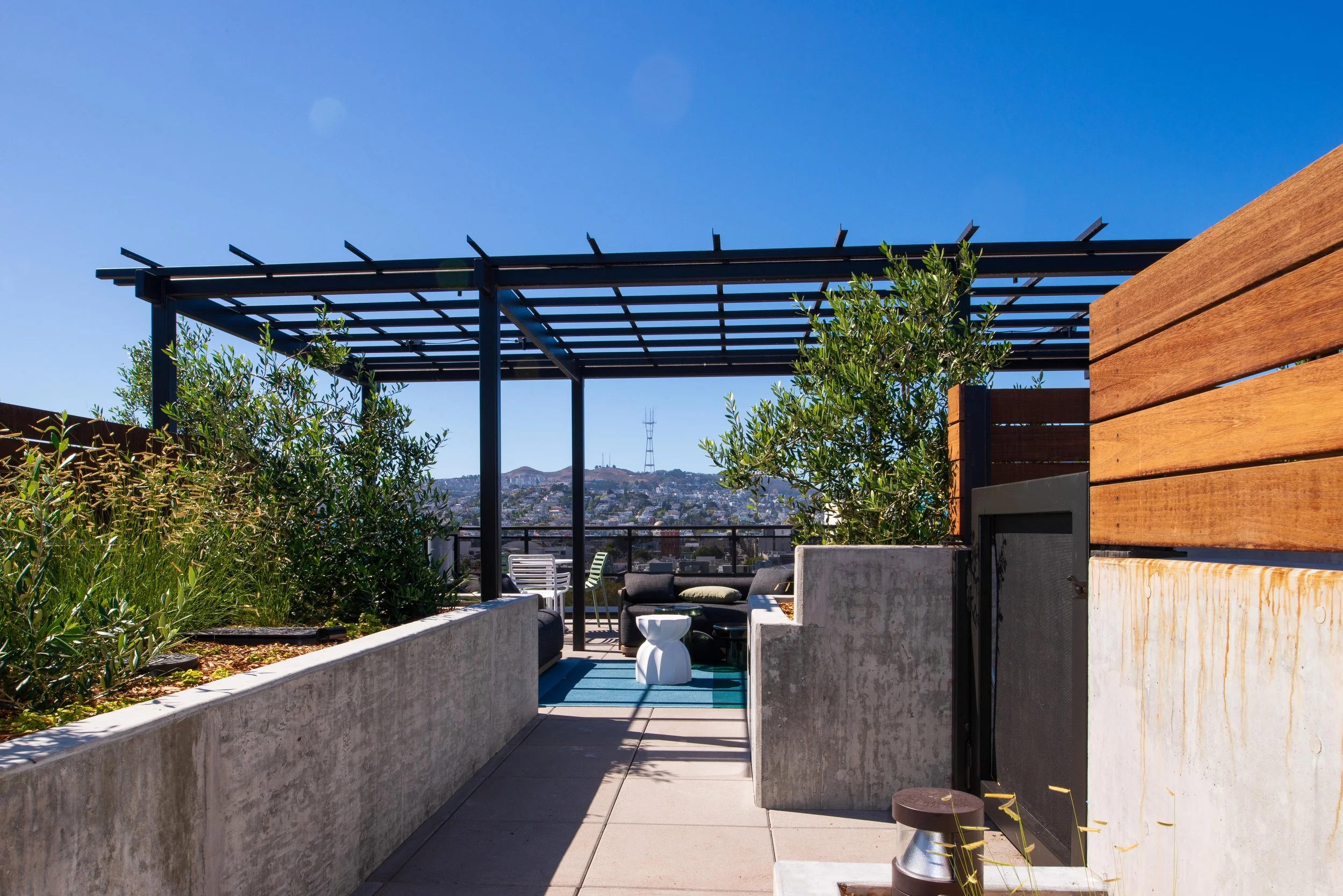 This six floor building offers 63 new housing units, constructed above the former Fitzgerald Furniture store in Potrero Hill. The existing brick walls and fenestration were retained in the architectural design. Mature New Zealand Christmas Trees were preserved in the streetscape design. On-structure landscapes are included on the first and second floors, culminating in with a 5,744 square foot roof amenity area. The project is LEED Silver Certified. Landscape areas and stormwater treatment planters address project run-off per SFPUC requirements.